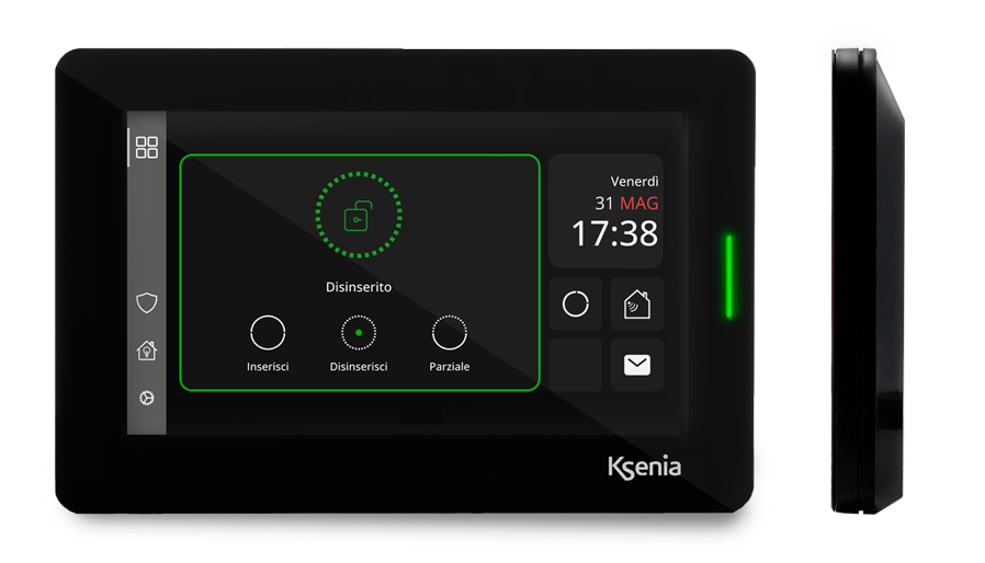 Il display, da 7 pollici con risoluzione1024x600, offre un’ampia visuale e un’eccellente qualità dell’immagine. È presente anche un lettore RFID integrato nello schermo, pensato per l’autenticazione dell’utente tramite tag RFID Ksenia.