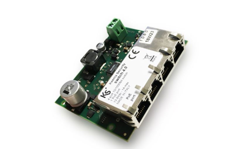 Cogliamo l’occasione per comunicarti anche l’introduzione di un utile accessorio per il collegamento delle ergo-T con la centrale: un compatto (dimensioni 60x75mm) switch di rete 4 porte (1 PoE) di nostra progettazione e alimentabile direttamente dalla centrale.